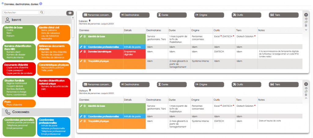 Par exemple, le traitement Gestion des accès à l’entreprise ne collecte pas les mêmes informations pour les salariés que pour les visiteurs, ou encore le traitement Gestion des formations implique des données distinctes pour les apprenants et les formateurs.
