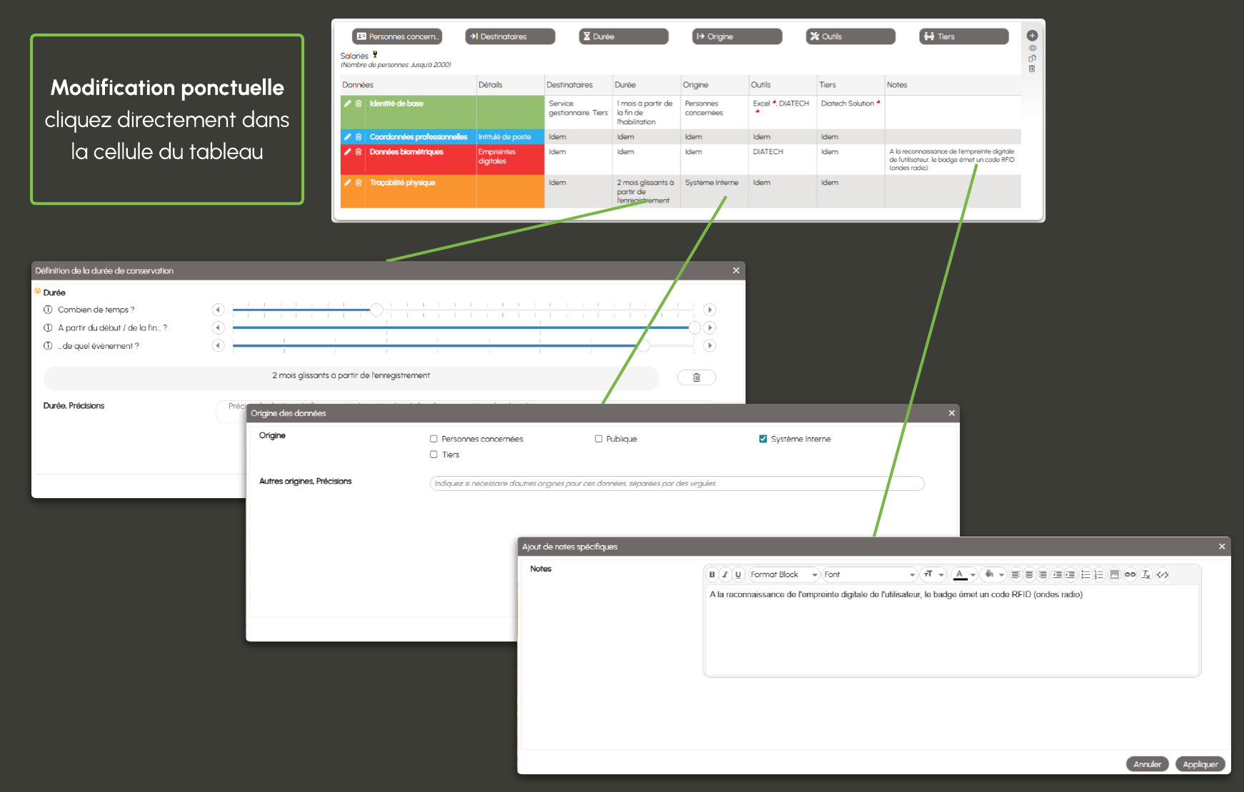 - Modification ponctuelle : cliquez directement dans la cellule du tableau que vous souhaitez modifier. Une fenêtre s’ouvre et vous permet de sélectionner une autre valeur ou d’ajouter une note.