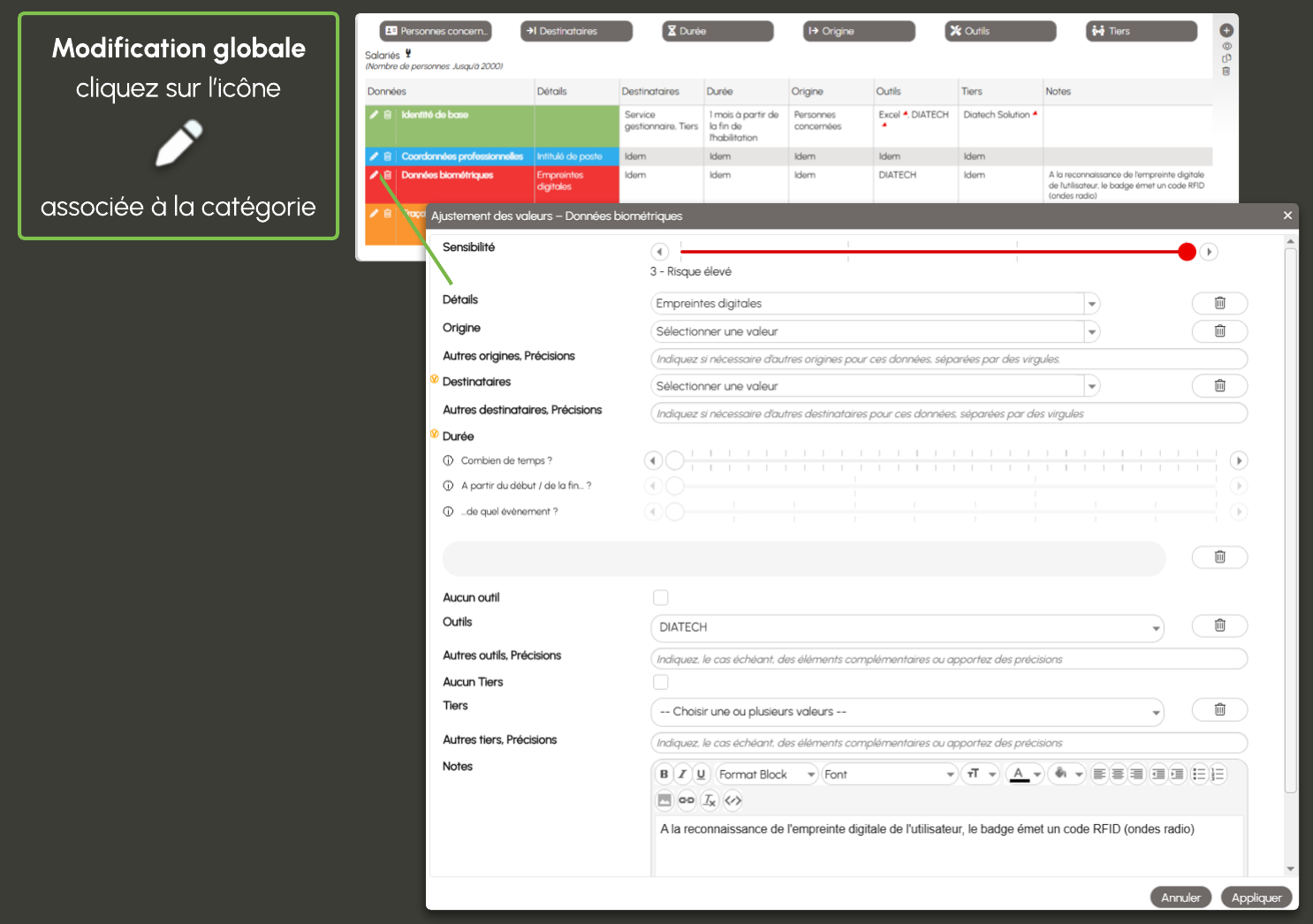 - Modification globale par catégorie : cliquez sur l’icône en forme de crayon associée à la catégorie. Une fenêtre dédiée s’ouvre et permet de modifier l’ensemble des valeurs et des notes pour cette catégorie de données