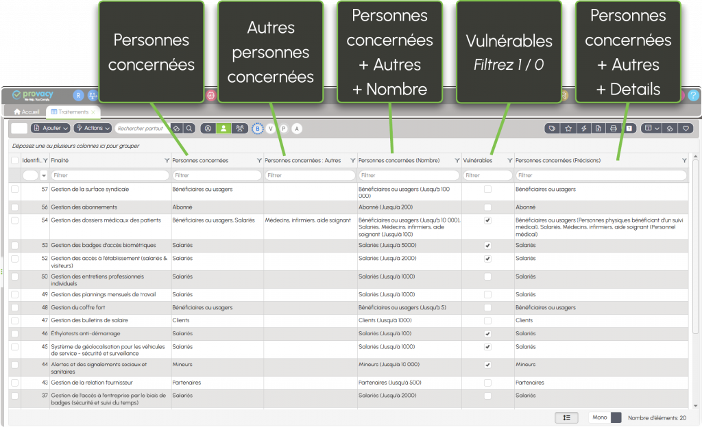 Conformément à l'article 30 du RGPD, les catégories de personnes doivent être identifiées et portées au registre.