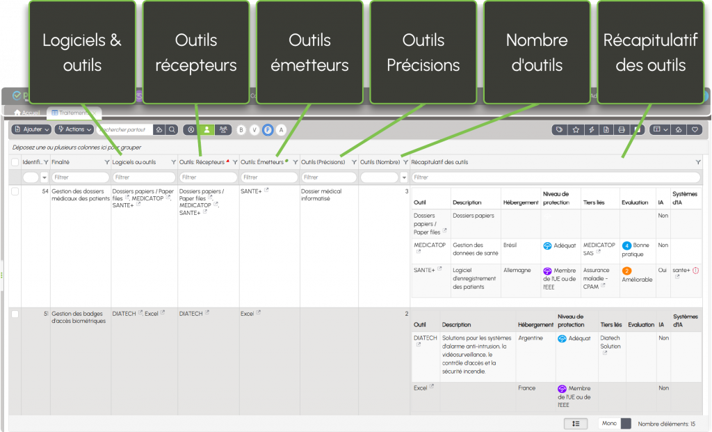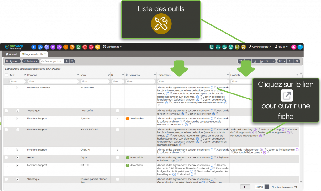 Depuis la liste des outils, affichez les traitements ou contrats de sous-traitance associés :