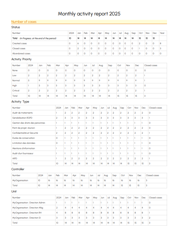 The dynamic report allows monthly monitoring of the number of activities and workloads (if the option is enabled), with filters by data controller, unit, year, and type of activity.