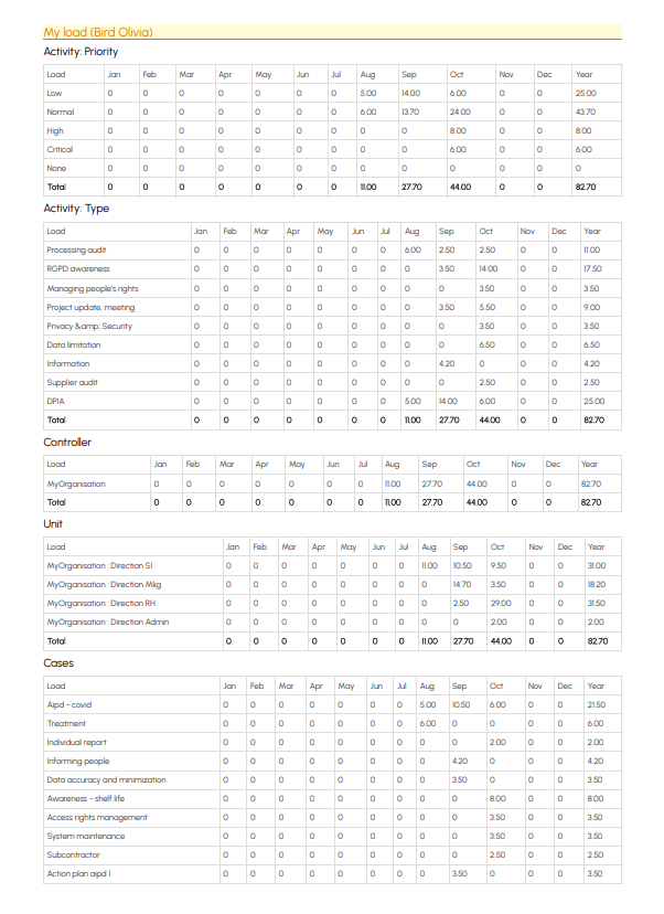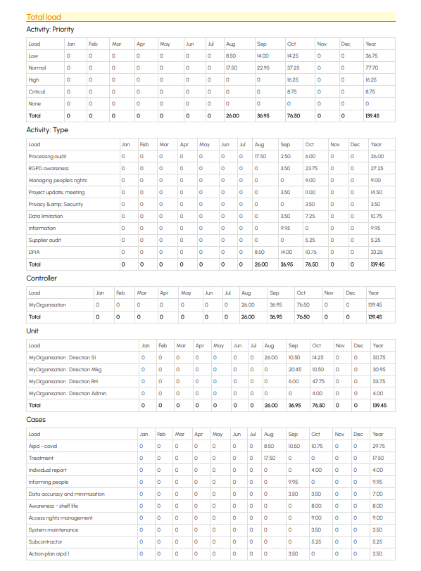 The Activities menu already allows you to document all your compliance-related actions. It now includes the ability to add workloads, specifying the time spent by each contributor on each activity.