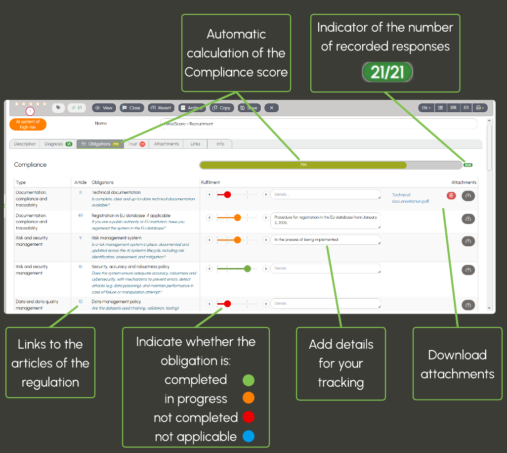 The Obligations tab provides a checklist and allows you to monitor and document each obligation. A compliance score is then automatically calculated based on their completion, which gives you: