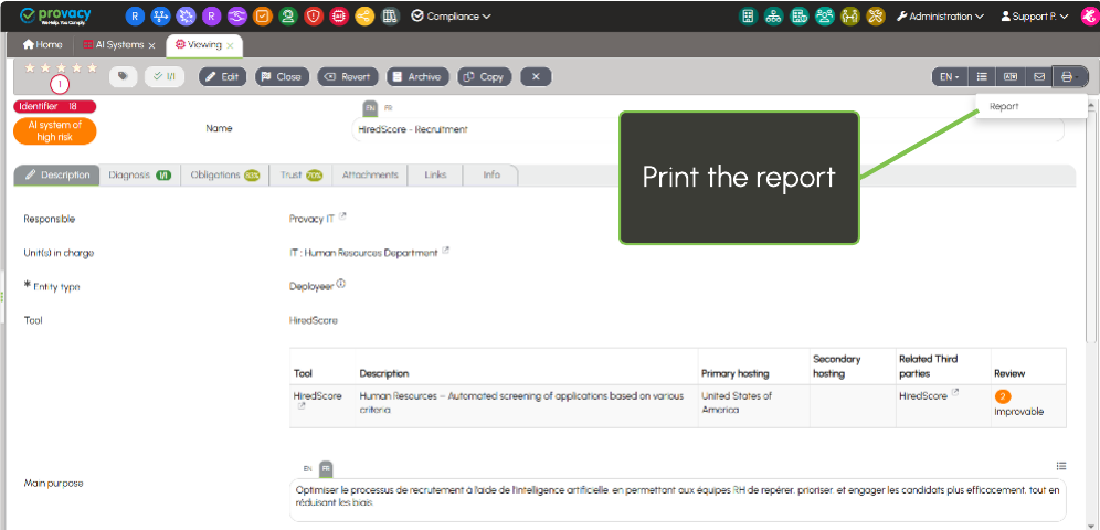 From the form, click on the printer and then on Report to generate a complete document of your AI system.