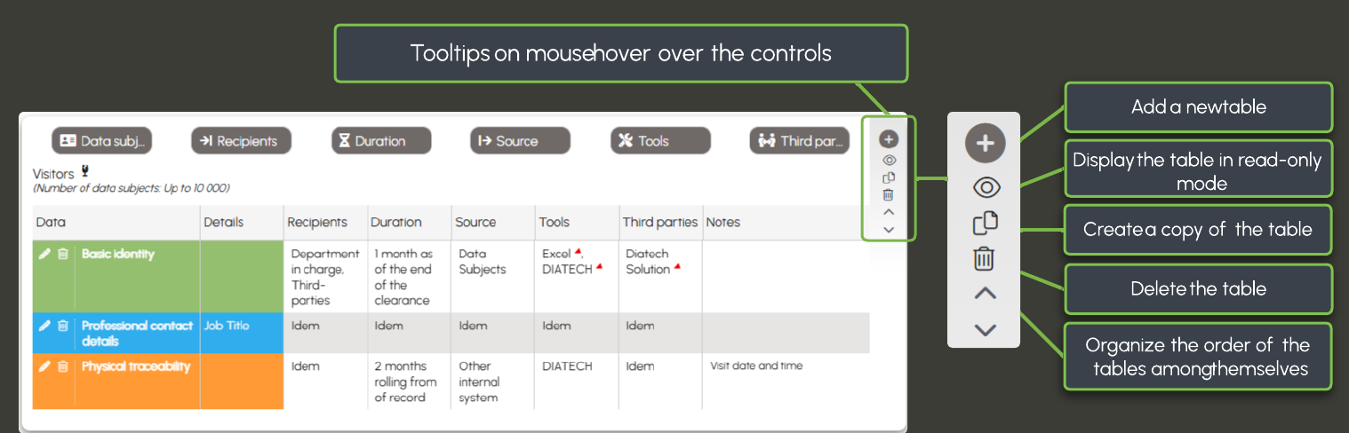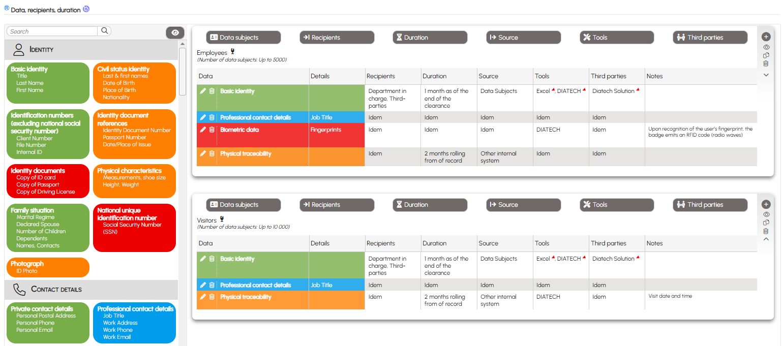 For example, the processing activity Access Management does not collect the same information for employees as for visitors; similarly, the Training Management processing involves different data for trainees and trainers.