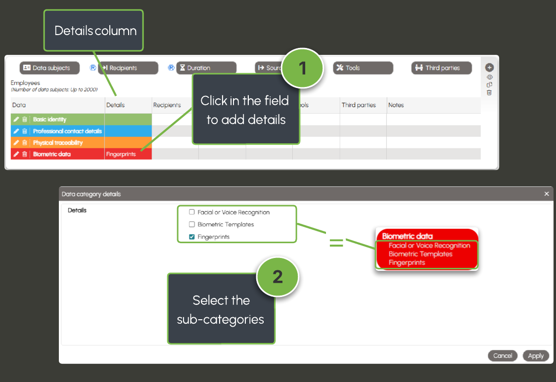 This column in the data table allows you to specify, on an optional basis, one or more sub-categories within a data category.