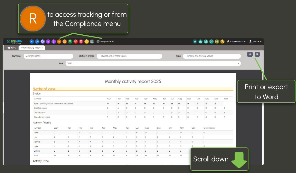 The dynamic report allows monthly monitoring of the number of activities and workloads (if the option is enabled), with filters by data controller, unit, year, and type of activity.