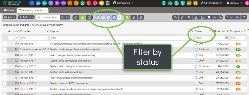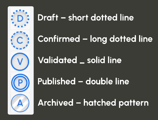 Symbols, made up of the first letter of the status, make them easy to identify.