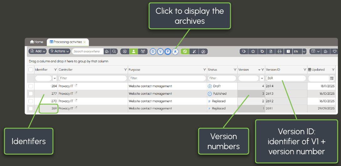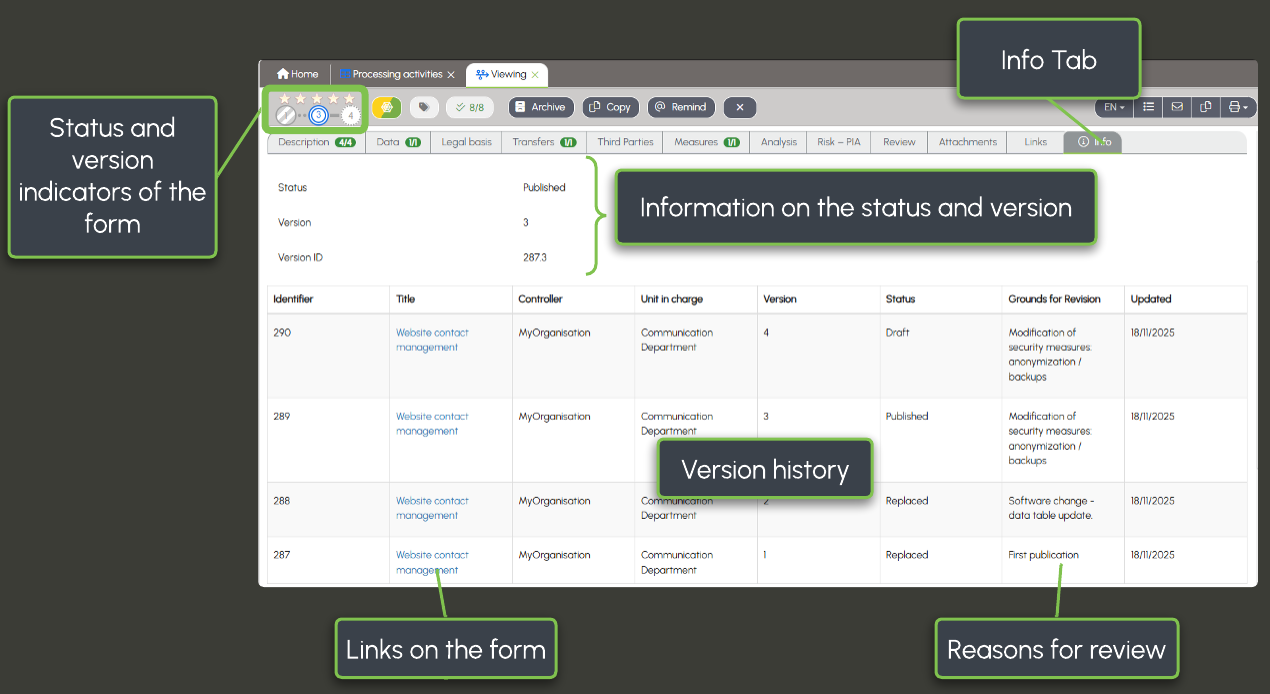 From the list of processing activities, you can display all versions of a form: