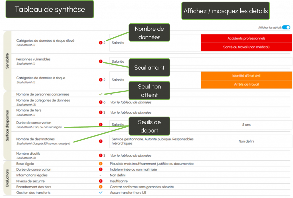 Pour les critères liés à l’exposition, le logiciel affiche des seuils de départ dans le tableau de synthèse. Cela signifie que le risque commence à augmenter à partir de certains niveaux, par exemple :
