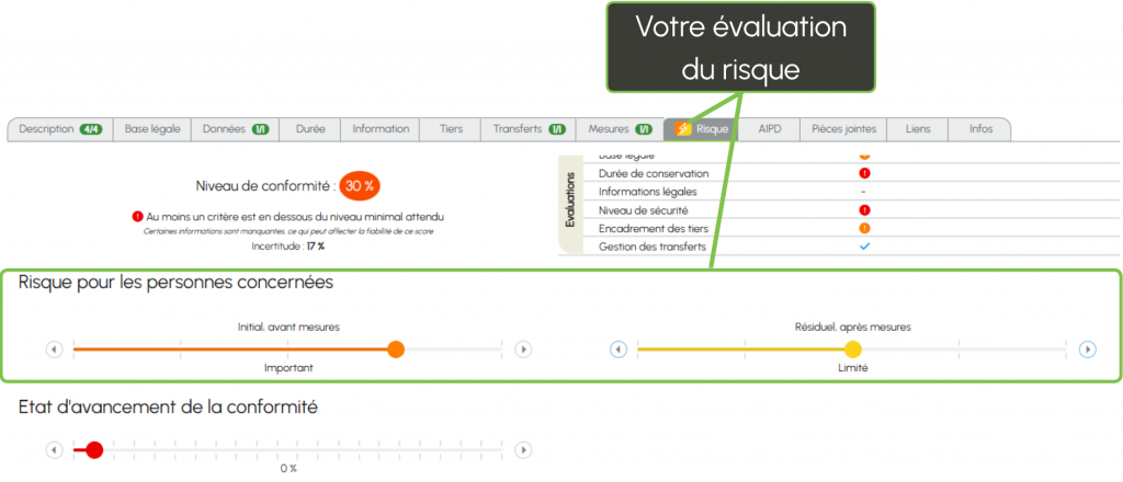 Le score proposé vous guide, mais ne remplace pas votre expertise : c’est bien l’utilisateur qui valide le niveau de risque final du traitement.
