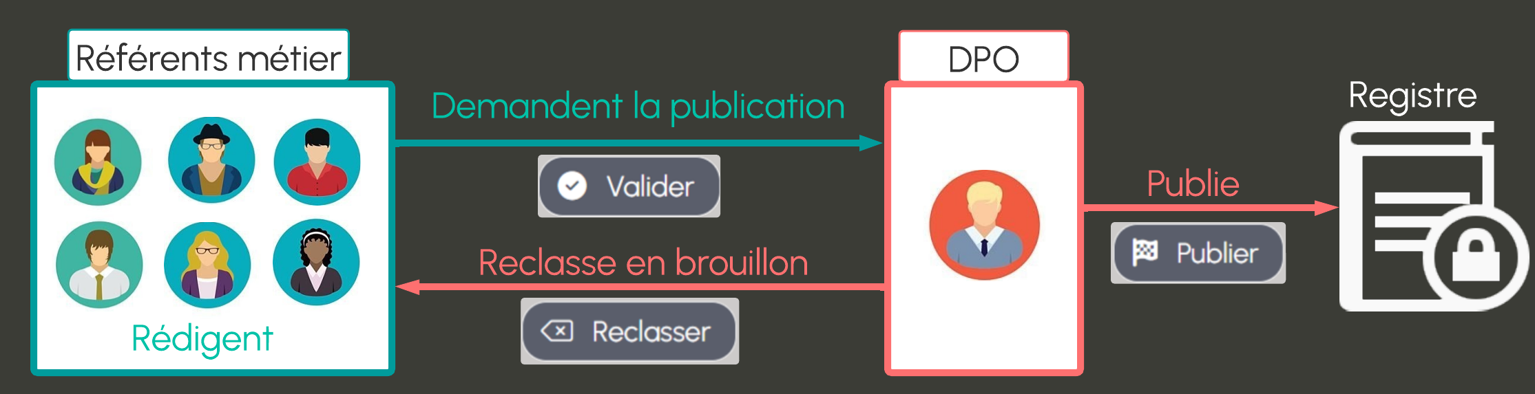 - Par défaut, seul le DPO publie les fiches, mais il peut être accompagné d’assistants DPO.