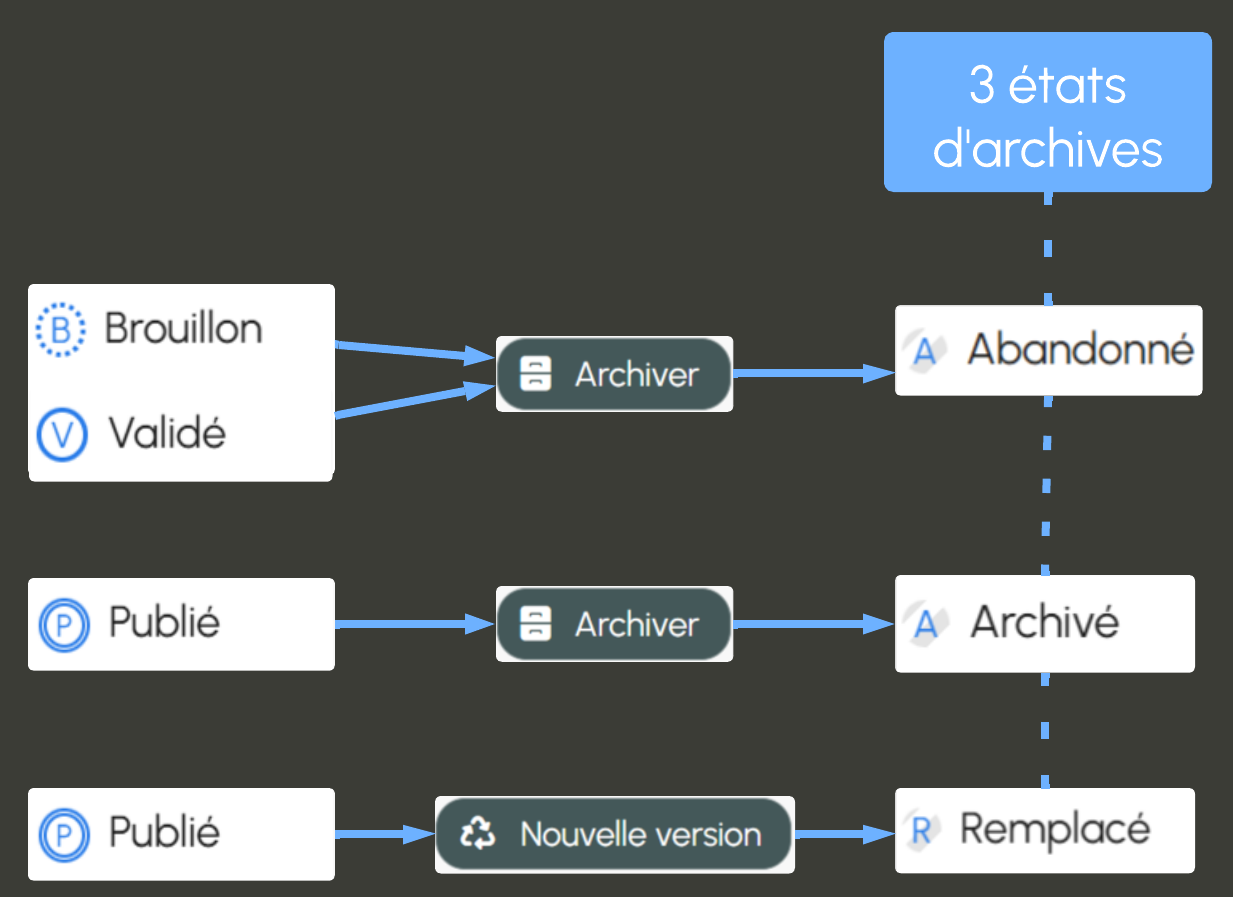 - Tant que la fiche n'a pas été publiée, son état sera Abandonné après l'archivage.