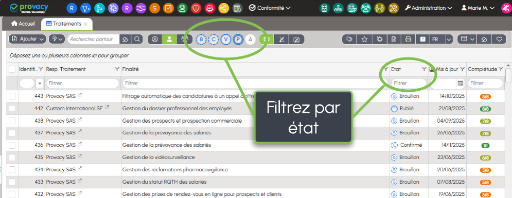 Par défaut, tous les états apparaissent dans les listes hormis les archives. Cliquez sur sur A pour les afficher.