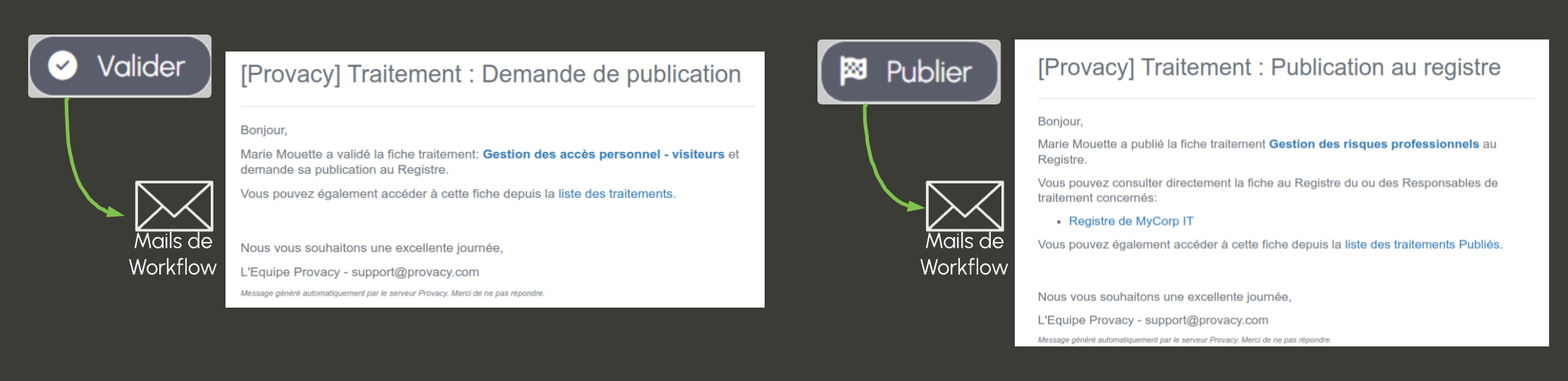 Pour chaque action, des emails automatiques sont envoyés aux personnes concernées, avec un lien direct vers la fiche.
