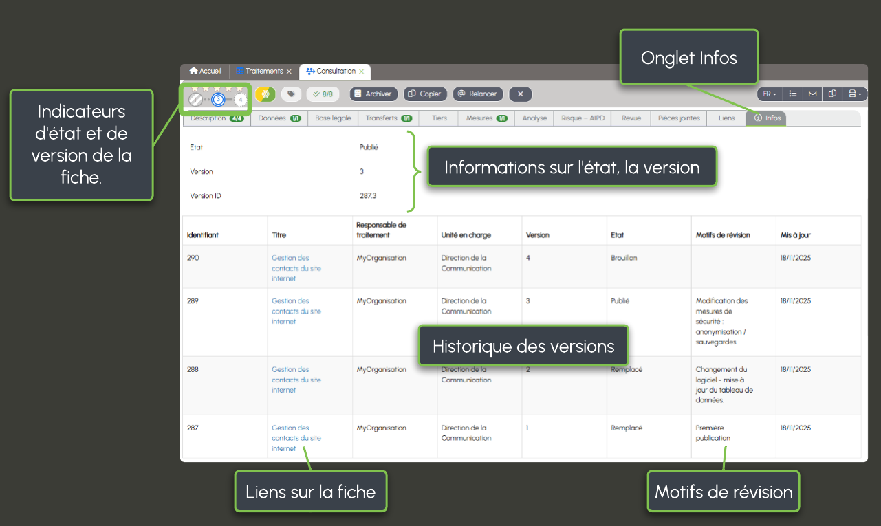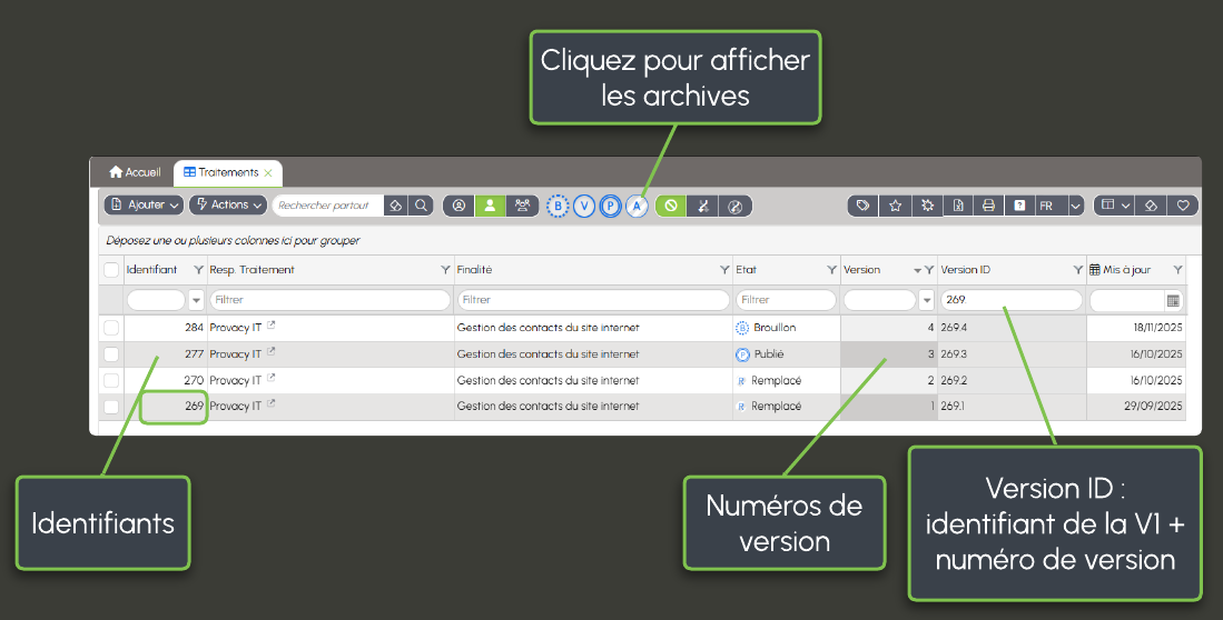 Depuis la liste des traitements, vous pouvez afficher toutes les versions d’une fiche :