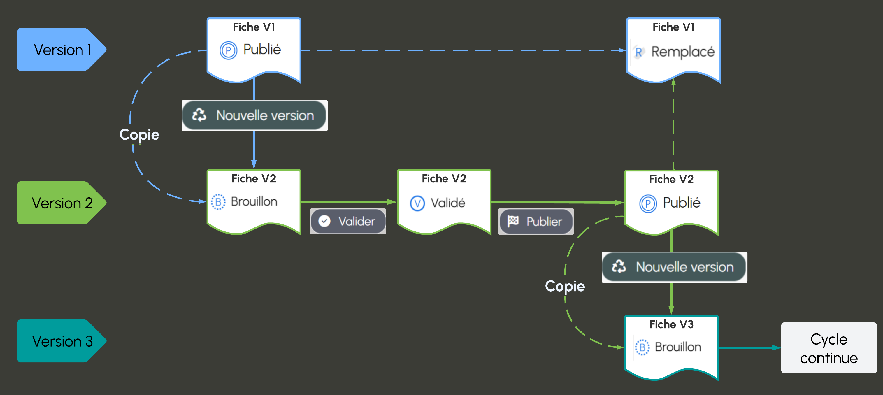 - L’action « Nouvelle version » crée automatiquement un brouillon V2.